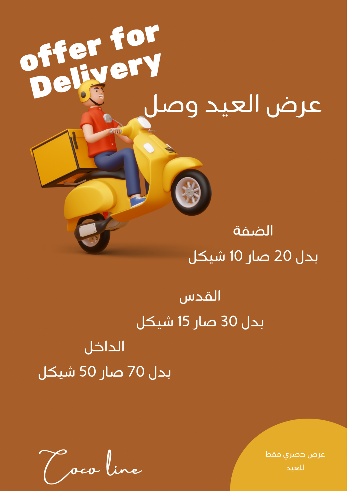 عرض العيد وصل التوصيل صار: الضفة بدل 20 صار 10 شيكل - الداخل بدل 70 شيكل 50 شيكل- القدس بدل 30 صار 15 شيكل